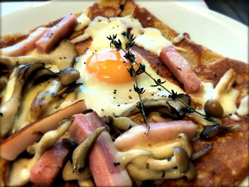 期間限定ガレットのキノコホワイトソースのご紹介です! ホワイトソースをベースにきのこ、ベーコン、チーズを使用した食べ応えのあるガレットです。 【10:00~14:00】の間はお得なLunchメニューもございますので是非お試しください!!