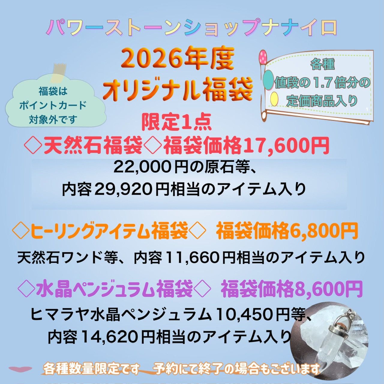 今回は原石福袋は1点のみとなります。そじて『天然石ワンド』『水晶ペンジュラム』のそれぞれ福袋をご用意しました。詳しくは画像をご覧ください。いずれもブレスレットは入らない福袋となります。数量限定につき予約で終了の場合がございます。