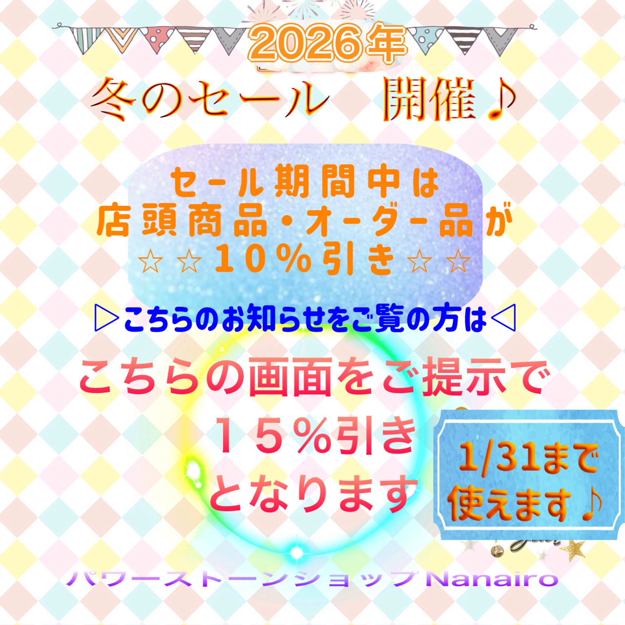 当店の冬のセール、1/18までとお知らせしていましたが、今回は1/25まで一週間、延長することにいたしました♪なお、このお知らせをご覧頂いている方は、この画面をご提示頂くと1月末まで、定価商品は割引価格となります!どうぞこの機会をご利用くださいね☺️