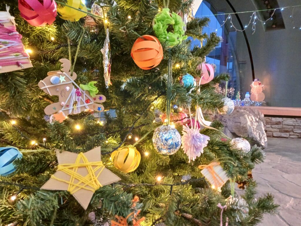 こちらのクリスマスツリーのオーナメントは、5番街1階のきっずてらすの子供たちが作ってくれたもので、飾り付けもしてくれました。