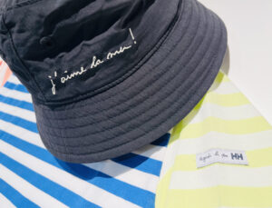 デザイナーのアニエスの手書きメッセージである“J’aime la mer!(海が好き)”の刺繍が入ったナイロン素材のハット・トートバック