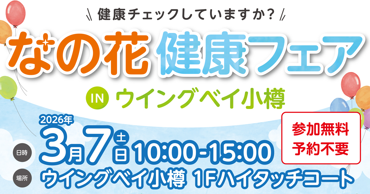 ウイングベイ小樽 2026年3月7日 なの花健康フェア in ウイングベイ小樽 2026.01.23 Post この記事のタイトルとURLをコピーする なの花薬局による相談コーナーや健康測定コーナー等を設けてフェアを開催します。 日時 3月7日土曜日 10時~15時 予約不要で参加も無料となっておりますので、お気軽にお立ち寄りください! 場所 5番街1階ハイタッチコート A2健康フェアポスター(確定)ダウンロード オタルボウル通信2月号 前の記事 2026年2月22日日曜日 12時~18時 TINY JAZZ STEPS一周年記念ライブ 次の記事
