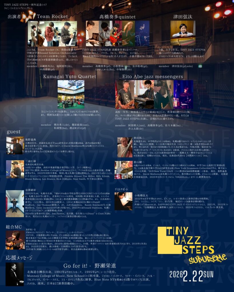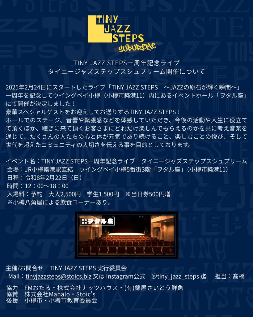 ウイングベイ小樽 2026年2月22日日曜日 12時~18時 TINY JAZZ STEPS一周年記念ライブ 2026.01.23 Post この記事のタイトルとURLをコピーする TINY JAZZ STEPS一周年記念ライブ ポスターダウンロード 2026年3月7日 なの花健康フェア in ウイングベイ小樽 前の記事 セレモニーアイテム入荷しました! 次の記事