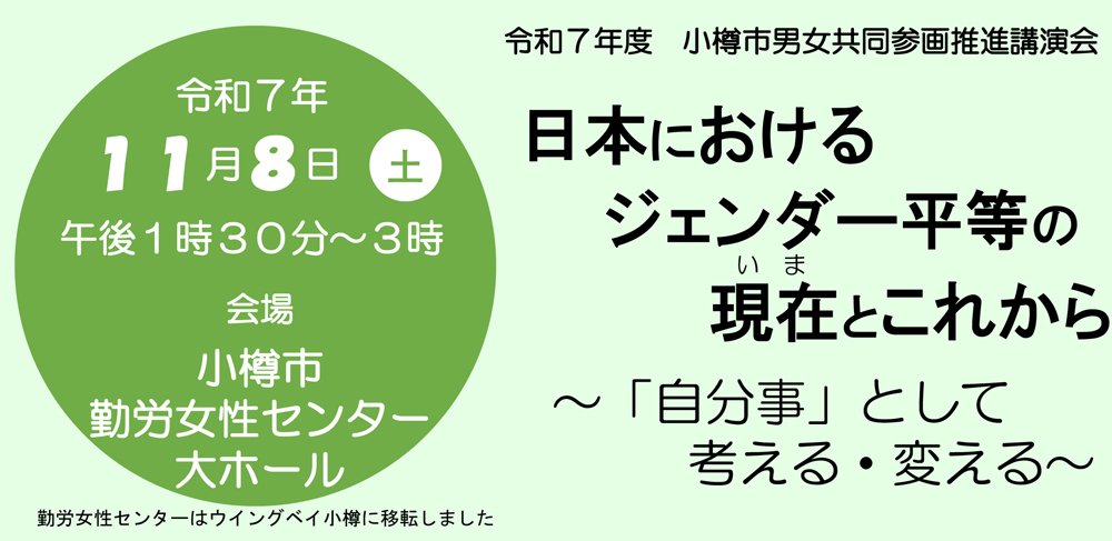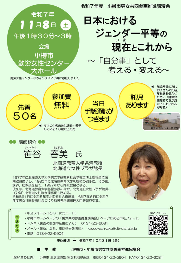 ウイングベイ小樽 2025.11.8 日本における ジェンダー平等の 現在とこれから 2025.10.22 Post この記事のタイトルとURLをコピーする ~「自分事」として 考える・変える~ 11月8日土曜日 午後1:30~3時 会場:小樽市勤労女性センター大ホール 講師:笹谷 晴美 主催:小樽市・小樽市男女共同参画推進協議会 目次先着50名参加費無料当日手話通訳が付きます託児あります先着50名 参加費無料 当日手話通訳が付きます 託児あります 営業に関するご案内 前の記事 よりスーツらしいカッチリ感のあるパジャマスーツが入荷いたしました! 次の記事