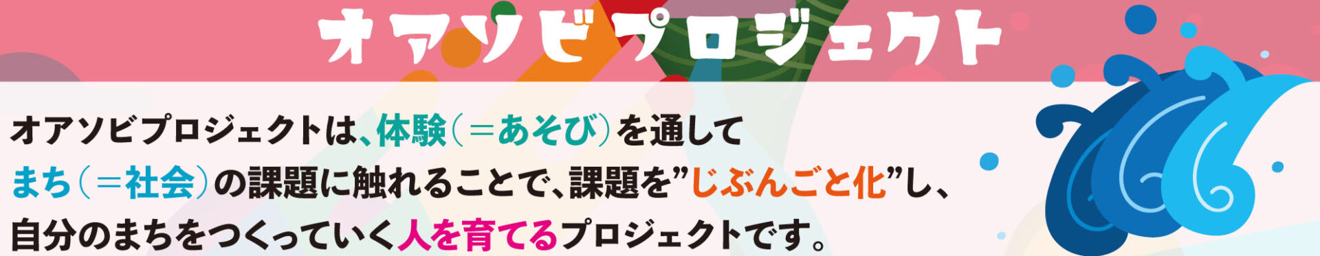 オアソビプロジェクトは、体験(=あそび)を通してまち(=社会)の課題に触れることで、課題を”じぶんごと化”し、自分のまちをつくっていく人を育てるプロジェクトです。
