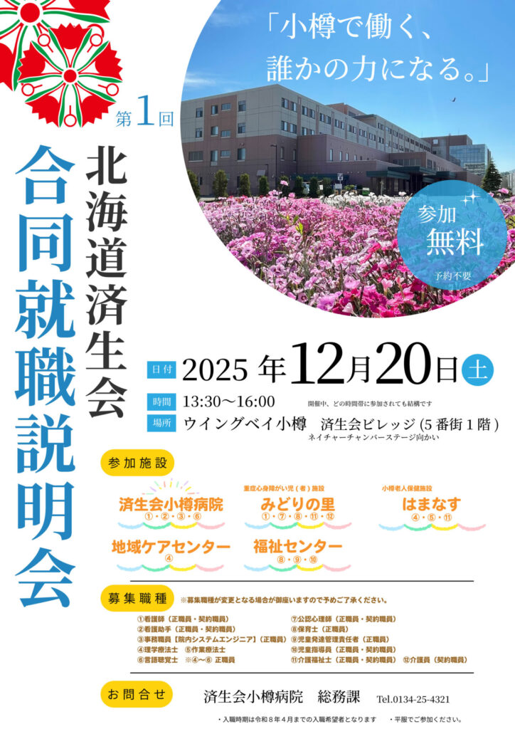 2025年12月20日(土)ウイングベイ小樽5番街1階 済生会ビレッジにおきまして合同就職説明会を開催いたします。