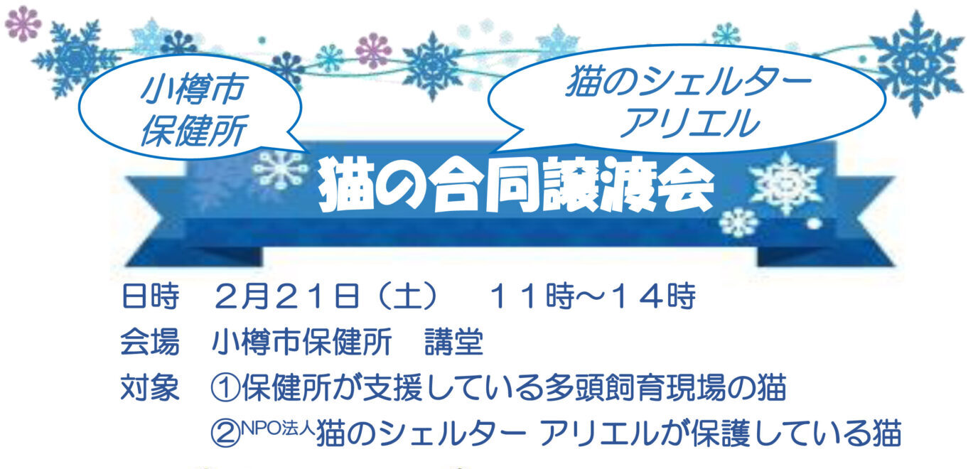 2026年2月21日(土)ウイングベイ小樽1番街4階 小樽市保健所にて、猫の合同譲渡会を開催いたします。