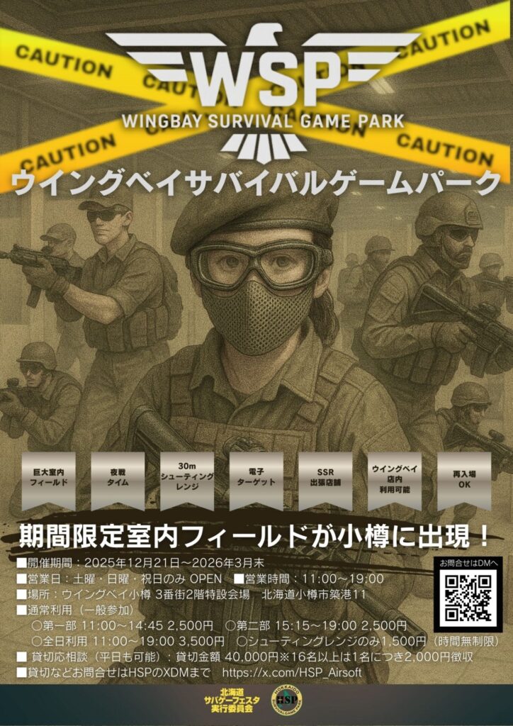 2025年12月21日(日)~2026年3月末の期間限定で、ウイングベイ小樽3番街2階 特設会場にて『ウイングベイサバイバルゲームパーク』がオープンします!!!